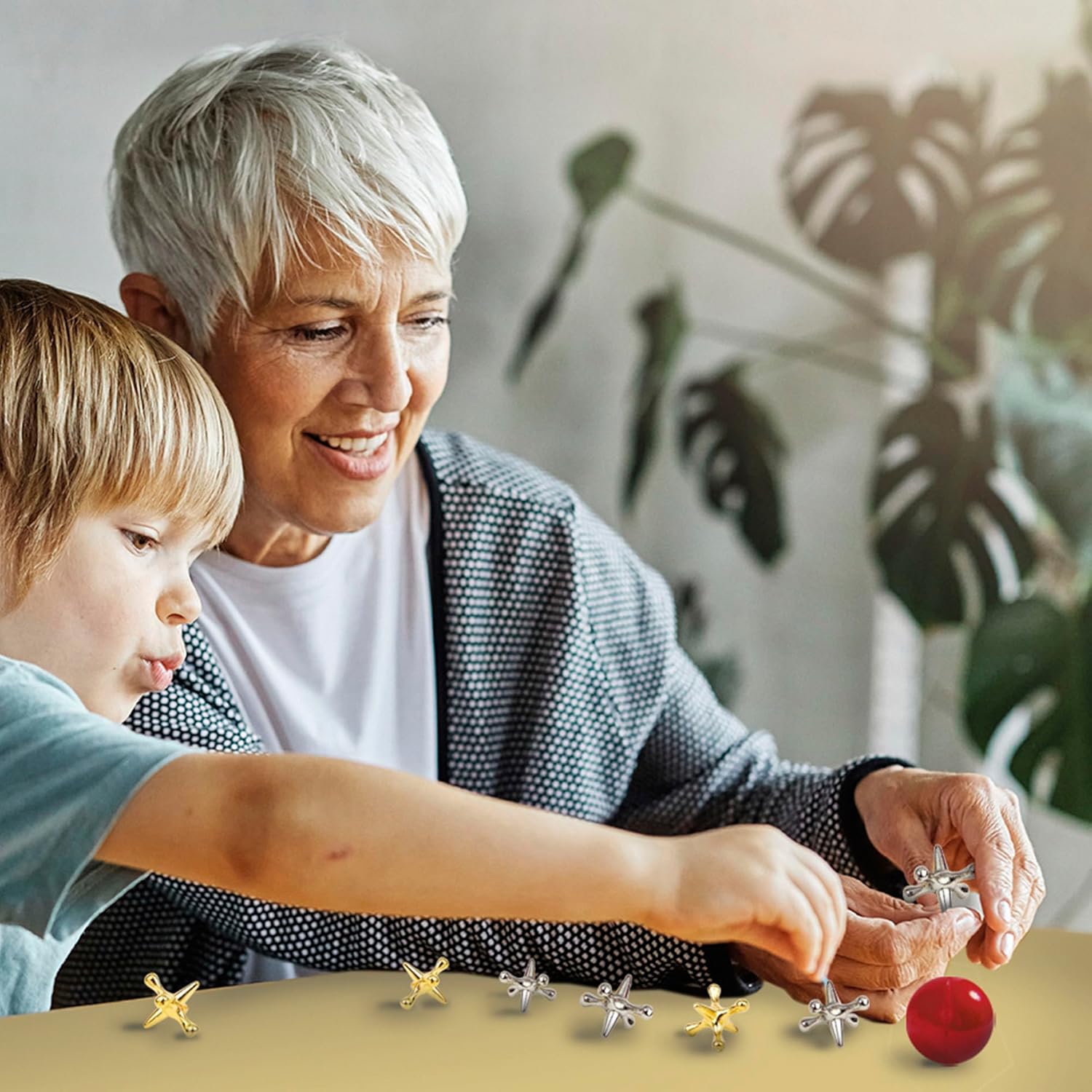 Schylling Old Fashioned Metal Jacks game is a classic because the play value is entertaining and it builds concentration and coordation across generations. Bounce the ball and grab a jack. With each new round of play pick up additional jacks. The player who reaches 10 first wins! While this game has a vintage feel. the fun resonates for all ages.